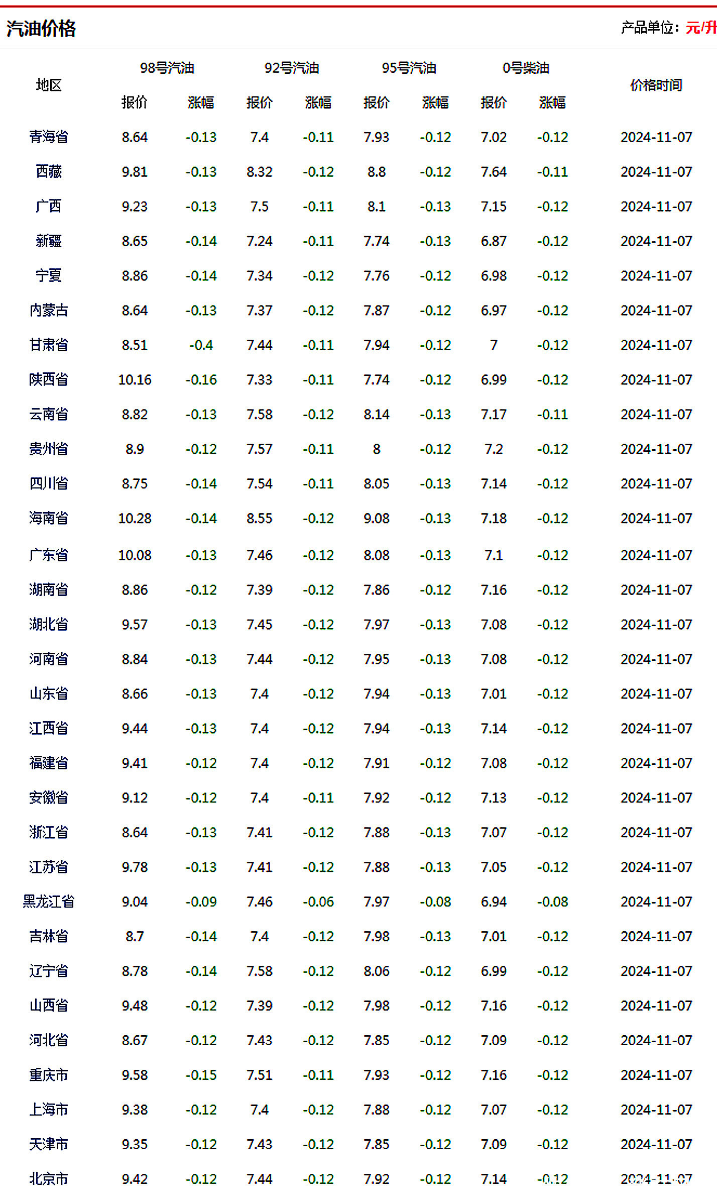 与此同期,在国内制品油市集,干涉11月末,本月油价调度“盖棺定论”,制品油呈现“1跌1搁浅”的场面,汽柴油统计下降145元以及140元/吨,折合升价,92,95号汽油每升下降0.11~0.13元驾驭。现时,国内各地加油站92,95号汽油以及0号柴油,不息前次降价后的水平,主流92号汽油踟蹰在7.4~7.5元/升,油价创下本年“第二低”的场面,住户用车压力一般,比拟年头,按照私家车50升容积,加满一箱油,猜度少花5.5块钱,寰宇各省加油站最新报价参考文末配图。